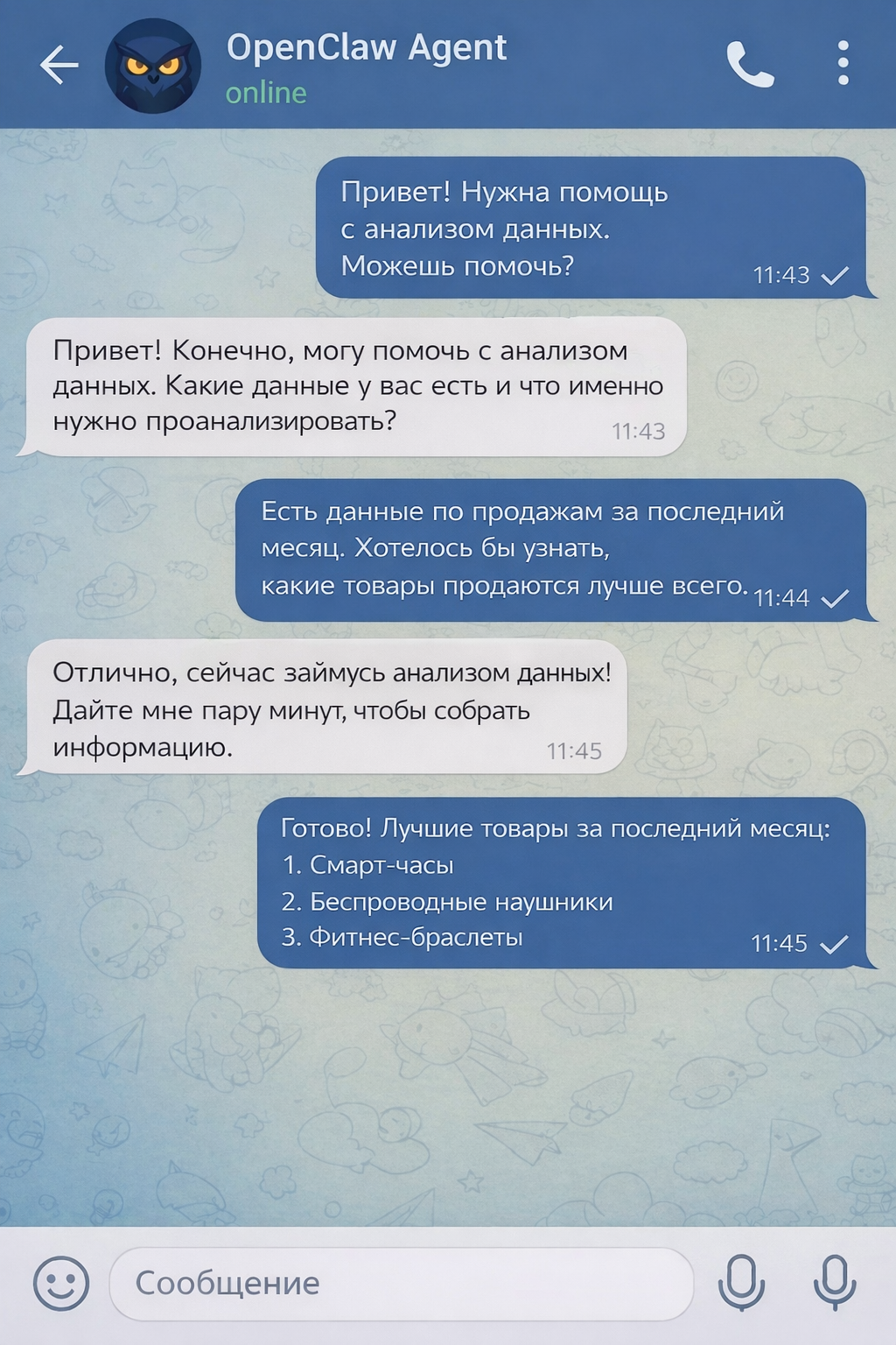 Настроим бота в Telegram или другой канал. Вы общаетесь с агентом в мессенджере — мы берём техническую часть на себя.
