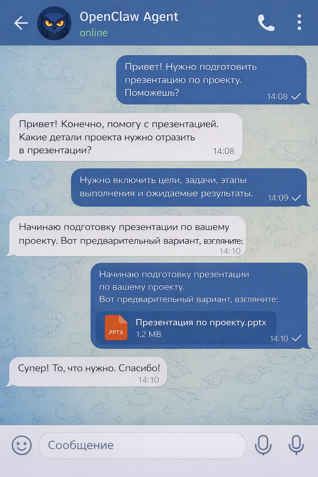 Подключим модель, веб-поиск, Telegram и память. Передадим готового агента — вы общаетесь с ним 24/7 в мессенджере или браузере.